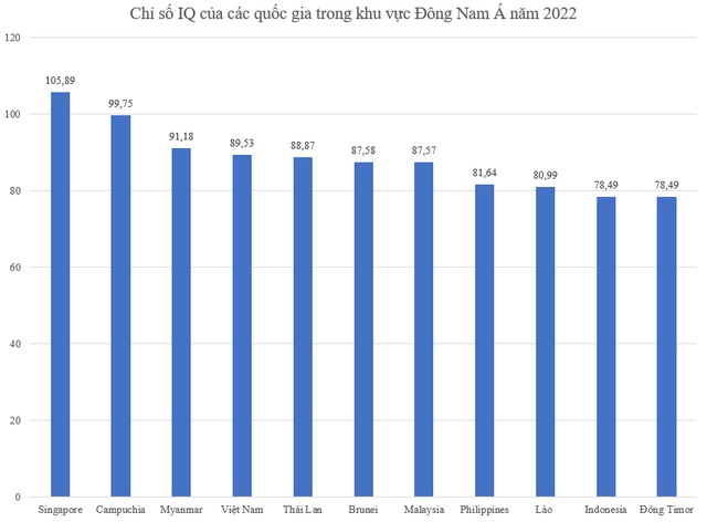 Trong khi đó, khi so sánh chỉ số IQ của các nước trong khu vực Đông Nam Á, đứng đầu là Singapore với 105,89 điểm, tiếp đến là Campuchia với 99,75 điểm và Myanmar với 91,18 điểm. Hiện nay, các quốc gia có chỉ số IQ cao hơn Việt Nam là Singapore, Campuchia, Myanmar.