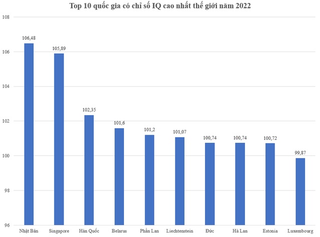 Theo dữ liệu mới nhất của WPR, Nhật Bản là quốc gia có chỉ số IQ cao nhất thế giới, đạt 106,48 điểm. Sau Nhật Bản, Singapore đứng ở vị trí thứ 2 với 105,89 điểm.